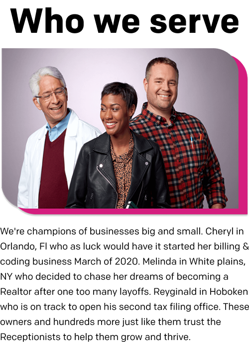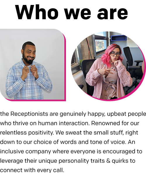 The Receptionists started back in 2014 when I needed someone to answer the phones for my cleaning company. Built on the belief that people still want to speak with an actual human. In a world where everything is automated, we believe personal connections still matter.